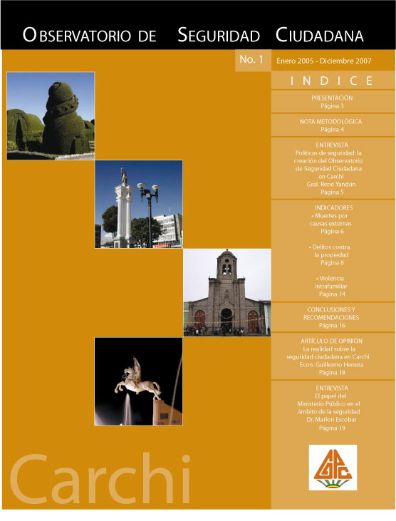 En este primer número se presentan los principales resultados encontrados para el establecimiento de la línea base correspondiente al período 2005-2007. El análisis de los indicadores sobre la situación de seguridad de la ciudadanía de Carchi permitirá observar claramente cuál ha sido el comportamiento de las cifras en dicho período y, sobre todo, identificar los posibles mecanismos y estrategias que permitan a las instituciones responsables controlar adecuadamente las distintas manifestaciones de la violencia.
