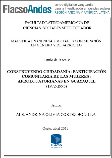 Cortez, A. O. (2013). Construyendo ciudadanía : participación comunitaria de las mujeres negras / afroecuatorianas en Guayaquil (1972-1995) (Tesis de Maestría en Ciencias Sociales con mención en Género y Desarrollo). FLACSO Sede Ecuador, Quito.
