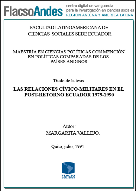 Vallejo Flores, Margarita (1991). Las relaciones cívico - militares en el post – retorno: Ecuador 1979-1990. Maestría en Ciencias Políticas en mención en Políticas Comparadas de los Países Andinos; FLACSO - Sede Ecuador. Quito. 81 p.
