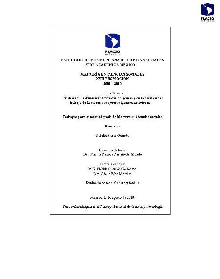 Flores Garrido, Natalia (2010). Cambios en la dinámica identitaria de género y en la división del trabajo en hombres y mujeres migrantes de retorno. Maestría en Ciencias Sociales; FLACSO México. México. 243 p.