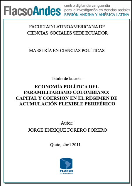 Forero, J. E. (2011). Economía política del paramilitarismo colombiano : capital y coerción en el régimen de acumulación flexible periférico (Tesis de Maestría en Ciencias Políticas). FLACSO Sede Ecuador, Quito.