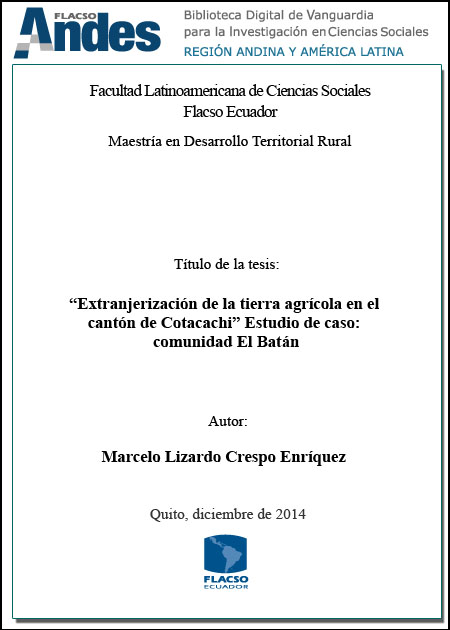 Crespo Enríquez, Marcelo Lizardo. 2014. Extranjerización de la tierra agrícola en el cantón Cotacachi. Estudio de caso: Comunidad El Batán. Tesis de maestría, Flacso Ecuador.