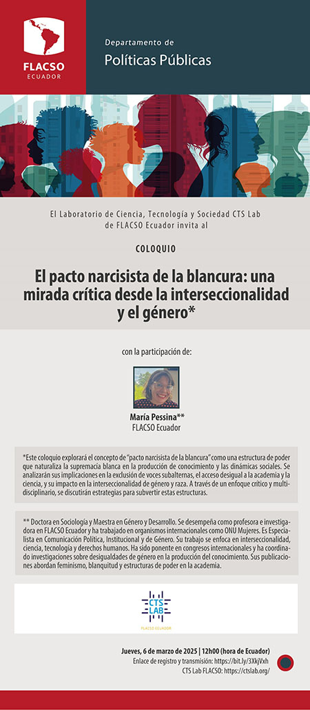 El Laboratorio de Ciencia, Tecnología y Sociedad CTS Lab de FLACSO Ecuador invita al Coloquio “El pacto narcisista de la blancura: una mirada crítica desde la interseccionalidad y el género”. Con la participación de María Pessina, el jueves 6 de marzo de 2025 a las 12h00 (hora Ecuador) : FLACSO Ecuador, Quito.
