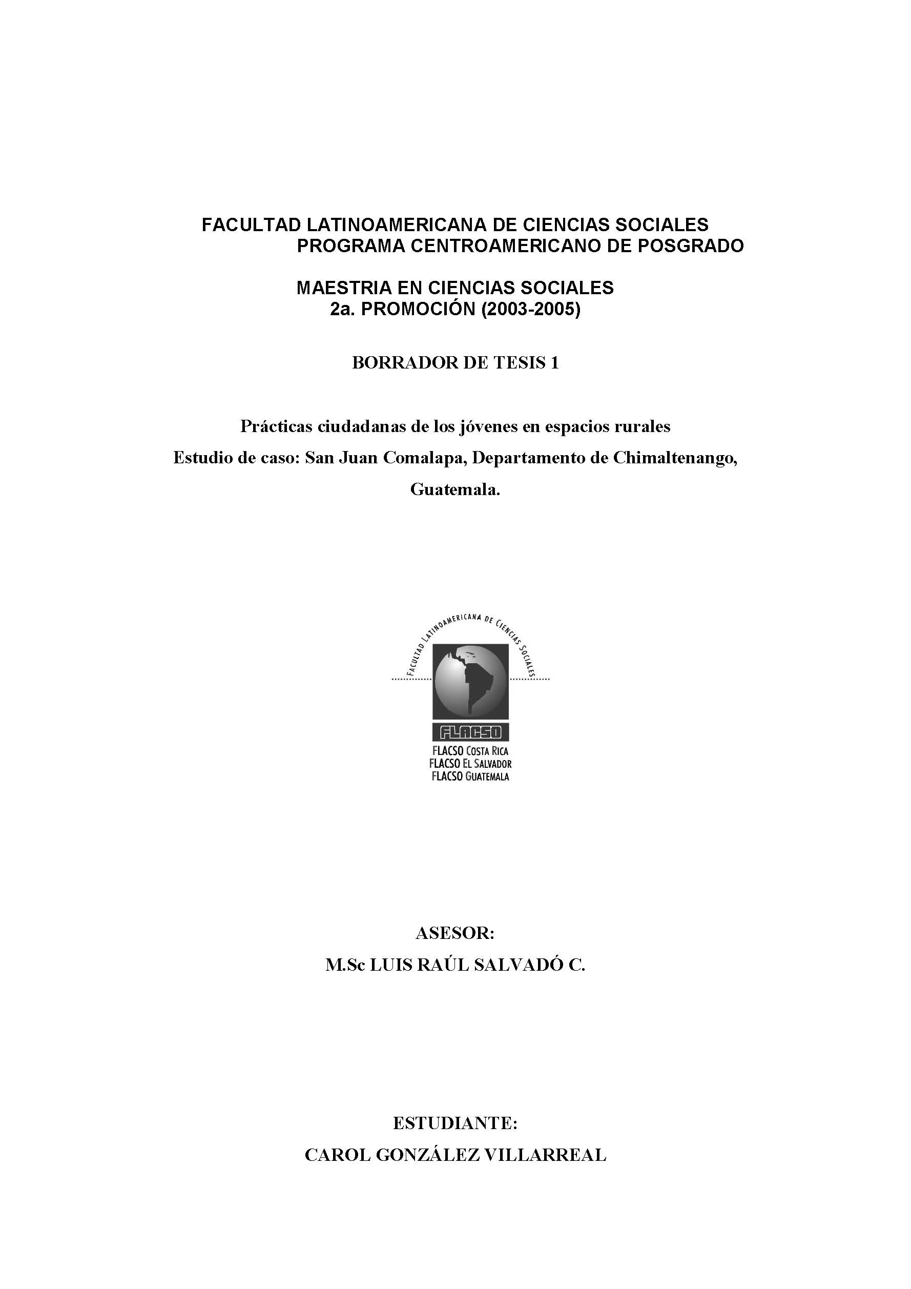 González Villarreal, Carol Cristina (2006). Prácticas ciudadanas de los jóvenes en espacios rurales : estudio de caso : San Juan Comalapa, Departamento de Chimaltenango, Guatemala. Maestría en Ciencias Sociales, FLACSO Programa Centroamericano de Postgrado. Guatemala. 234 p.
