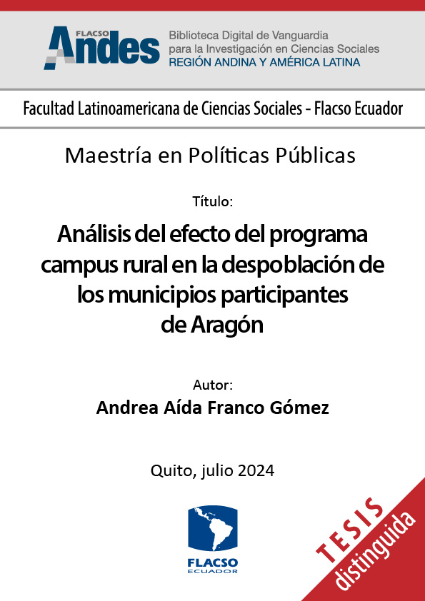 Franco Gómez, Andrea Aída. 2024. Análisis del efecto del programa campus rural en la despoblación de los municipios participantes de Aragón. Tesis de maestría, Flacso Ecuador.