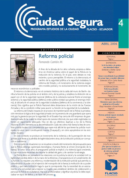 Ciudad segura. FLACSO sede Ecuador. Programa de Estudios de la Ciudad. Quito: FLACSO, (no. 04, abril 2006): 12 p.