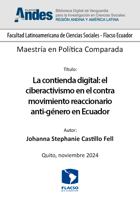 Castillo Fell, Johanna Stephanie. 2024. La contienda digital: el ciberactivismo en el contra movimiento reaccionario anti-género en Ecuador. Tesis de maestría, Flacso Ecuador.