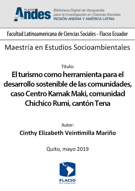 Veintimilla Mariño, Cinthy Elizabeth. 2019. El turismo como herramienta para el desarrollo sostenible de las comunidades, caso Centro Kamak Maki, comunidad Chichico Rumi, cantón Tena. Tesis de maestría, Flacso Ecuador.