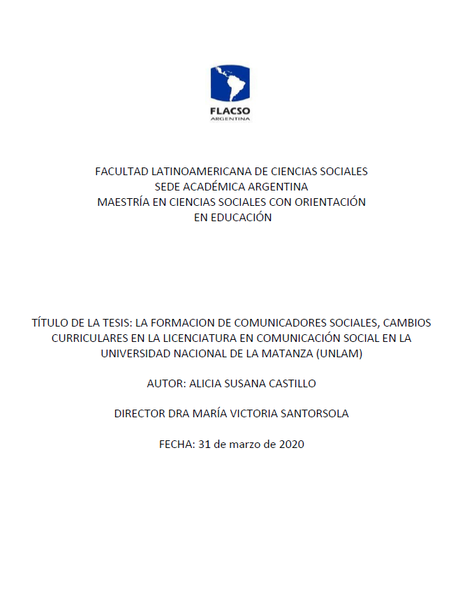 Castillo, Alicia Susana. (2020). La formación de comunicadores sociales, cambios curriculares en la Licenciatura en Comunicación Social en la Universidad Nacional de La Matanza (UNLAM). Tesis de Maestría. FLACSO. Sede Académica Argentina, Buenos Aires.