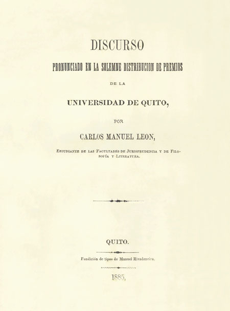 León, Carlos Manuel. 1885. Discurso pronunciado en la solemne distribución de premios de la Universidad de Quito. Quito, Ecuador : Fundición de tipos de Manuel Rivadenerira.