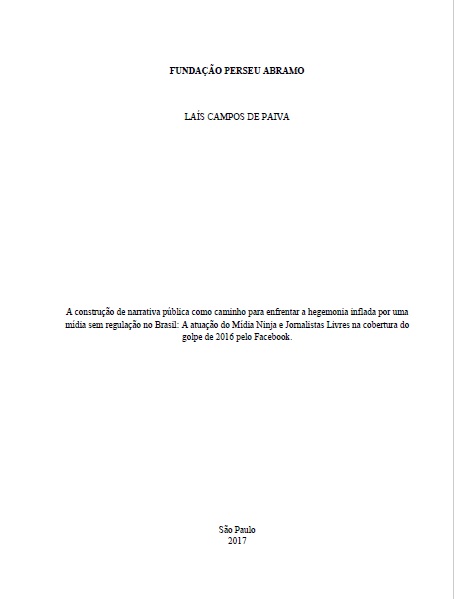 Campos de Paiva, Laís. 2017. A construção de narrativa pública como caminho para enfrentar a hegemonia inflada por uma mídia sem regulação no Brasil: a atuação do Mídia Ninja e Jornalistas Livres na cobertura do golpe de 2016 pelo Facebook. Tesis de maestría, Flacso Brasil.