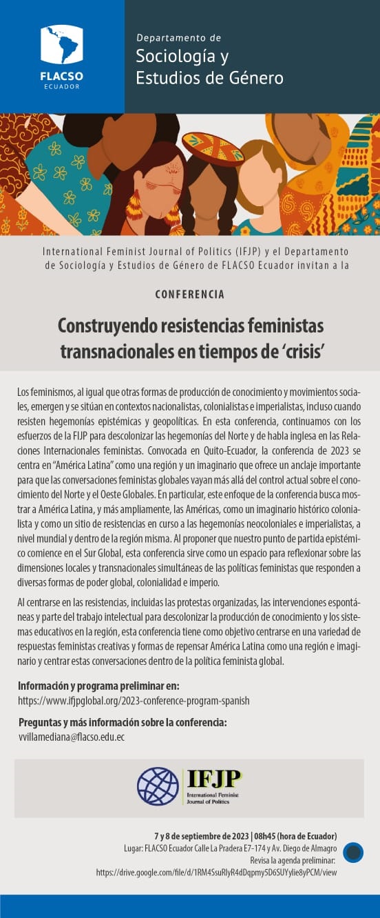 El Departamento de Sociología y Estudios de Género de FLACSO Ecuador invitan a la conferencia Construyendo resistencias feministas transnacionales en tiempos de 'crisis' en Flacso Ecuador. Con la partición de Claudia V. Grados Bueno, Alina Heuser, Gisselle Vila Benites, Sandra W. Rodríguez Castañeda, K. Melchor Quick Hall, Cristina Cucurí, Tchella Maso, Esperanza Martínez, Lineth Calapucha, Dayuma Nango, Susanne Zwingel, Norita Mdege, Armen Álvarez, Pamela Nwakanma, Mariana Medeiros Costa, - Ahmed Qais Munhazim, Purita Pelayo, Juanita Bone, María Emilia Durán, Katy Machoa y Silvia Vega, el 07 y 08 de septiembre de 2003 a las 08h45 (hora Ecuador) : FLACSO Ecuador, Quito.