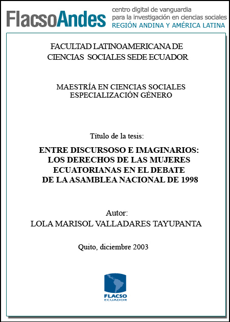 Valladares Tayupanta, Lola Marisol (2003). Entre discursos e imaginarios: los derechos de las mujeres ecuatorianas en el debate de la Asamblea Nacional de 1998. Maestría en Ciencias Sociales, especialización en Género; FLACSO - Sede Ecuador. Quito. 158 p.