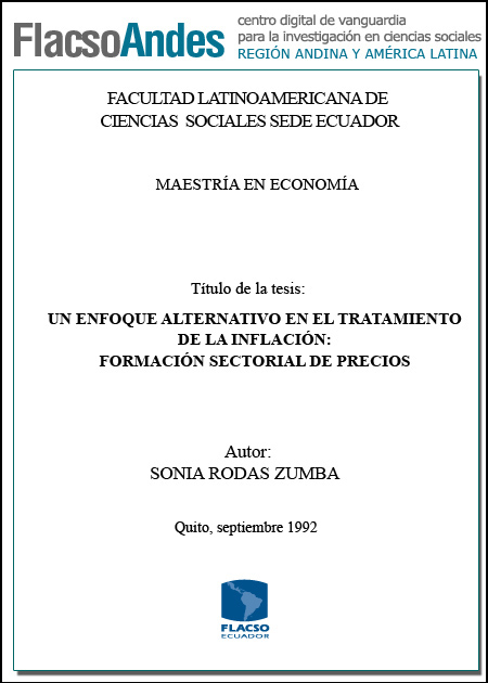 Rodas Zumba, Sonia (1992). Un enfoque alternativo en el tratamiento de la inflación: formación sectorial de precios. Maestría en Economía; FLACSO - Sede Ecuador. Quito. 104 p.