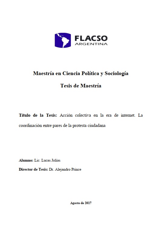 Jolías, Lucas (2018). Acción colectiva en la era de internet : la coordinación entre pares de la protesta ciudadana. Tesis de Maestría. FLACSO. Sede Académica Argentina, Buenos Aires.