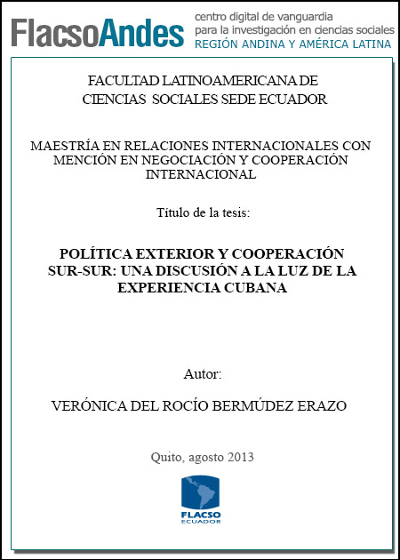 Bermúdez, V. R. (2013). Política exterior y cooperación sur-sur : una discusión a la luz de la experiencia cubana (Tesis de Maestría en Relaciones Internacionales con mención en Negociación y Cooperación Internacional). FLACSO Sede Ecuador, Quito.