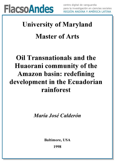 Calderón, María José (1998). Oil Transnationals and the Huaorani community of the Amazon basin: redefining development in the Ecuadorian rainforest. Master of Arts. University of Maryland, Faculty of the Graduate School. Baltimore County. 108 p.