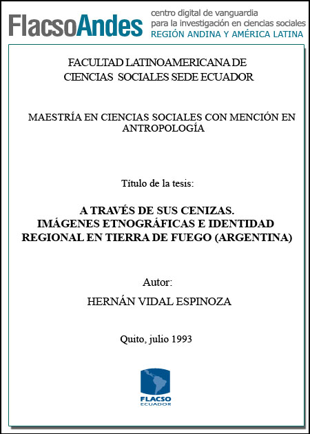 Vidal Espinoza, Hernán (1993). A través de sus cenizas. Imágenes etnográficas e identidad regional en Tierra de Fuego (Argentina). Maestría en Antropología. FLACSO sede Ecuador. Quito. 124 p.