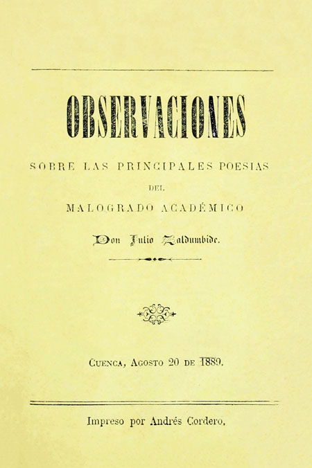 Cordero Crespo, Luis. 1889. Observaciones sobre las principales poesías del malogrado académico Don Julio Zaldumbide. Cuenca, Ecuador : Impreso por Andrés Cordero.