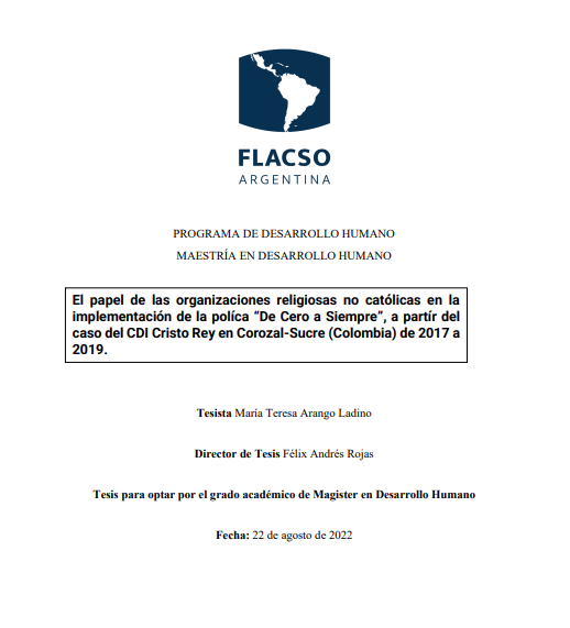 Arango Ladino, María Teresa (2022). El papel de las organizaciones religiosas no católicas en la implementación de la política “De Cero a Siempre”, a partir del caso del CDI Cristo Rey en Corozal - Sucre (Colombia) de 2017 a 2019. Tesis de Maestría. FLACSO. Sede Académica Argentina, Buenos Aires.