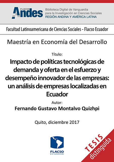 Montalvo Quizhpi, Fernando Gustavo. 2017. Impacto de políticas tecnológicas de demanda y oferta en el esfuerzo y desempeño innovador de las empresas: un análisis de empresas localizadas en Ecuador. Tesis de maestría, Flacso Ecuador.