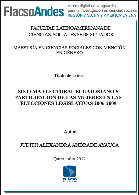 Andrade Ayauca, Judith Alexandra (2012). Sistema electoral ecuatoriano y participación de las mujeres en las elecciones legislativas 2006 y 2009. Maestría en Ciencias Sociales con mención en Género, FLACSO Sede Ecuador. Quito, 115 p.