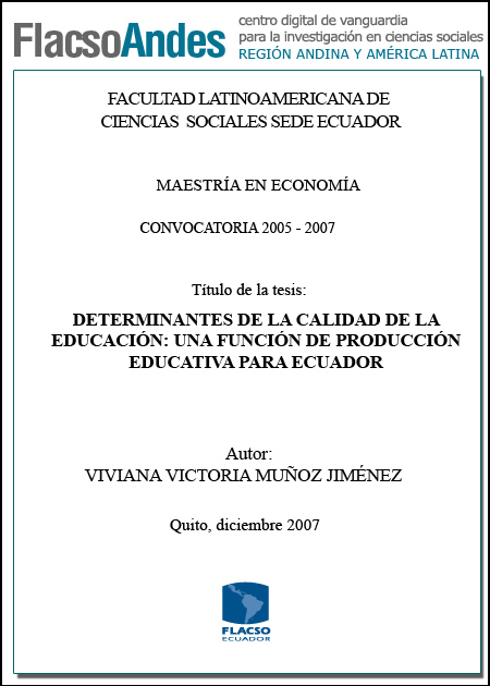 Muñoz Jiménez, Viviana Victoria (2007) Determinantes de la calidad de la educación: una función de producción educativa para Ecuador. Maestría en Economía; FLACSO sede Ecuador. Quito. 47 p.