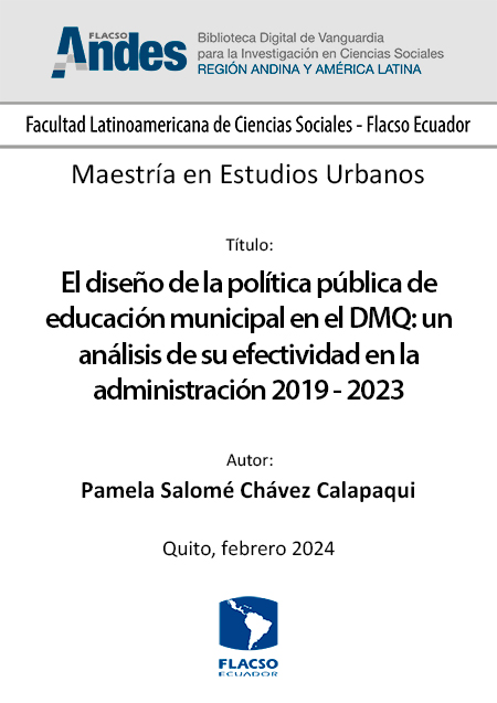 Chávez Calapaqui, Pamela Salomé. 2024. El diseño de la política pública de educación municipal en el DMQ: un análisis de su efectividad en la administración 2019 - 2023. Tesis de maestría, Flacso Ecuador.