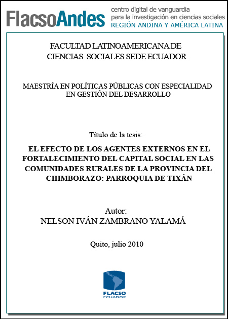Zambrano Yalamá, Nelson Iván (2010). El efecto de los agentes externos en el fortalecimiento del capital social en las comunidades rurales de la Provincia del Chimborazo: Parroquia de Tixán. Maestría de Políticas Públicas con especialidad en Gestión del Desarrollo; FLACSO sede Ecuador. Quito. 155 p.