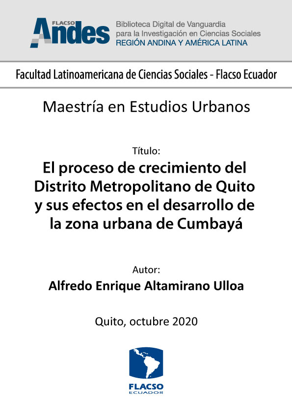 Altamirano Ulloa, Alfredo Enrique. 2020. El proceso de crecimiento del Distrito Metropolitano de Quito y sus efectos en el desarrollo de la zona urbana de Cumbayá. Tesis de maestría, Flacso Ecuador.