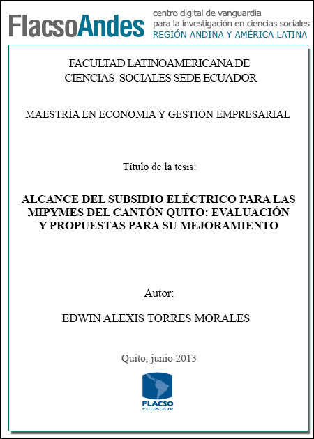 Torres, E. A. (2013). Alcance del subsidio eléctrico para las MYPIMES del Cantón Quito : evaluación y propuestas para su mejoramiento (Tesis de Maestría en Economía y Gestión Empresarial). FLACSO Sede Ecuador, Quito.