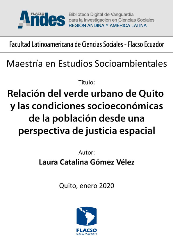 Gómez Vélez, Laura Catalina. 2020. Relación del verde urbano de Quito y las condiciones socioeconómicas de la población desde una perspectiva de justicia espacial. Tesis de maestría, Flacso Ecuador.