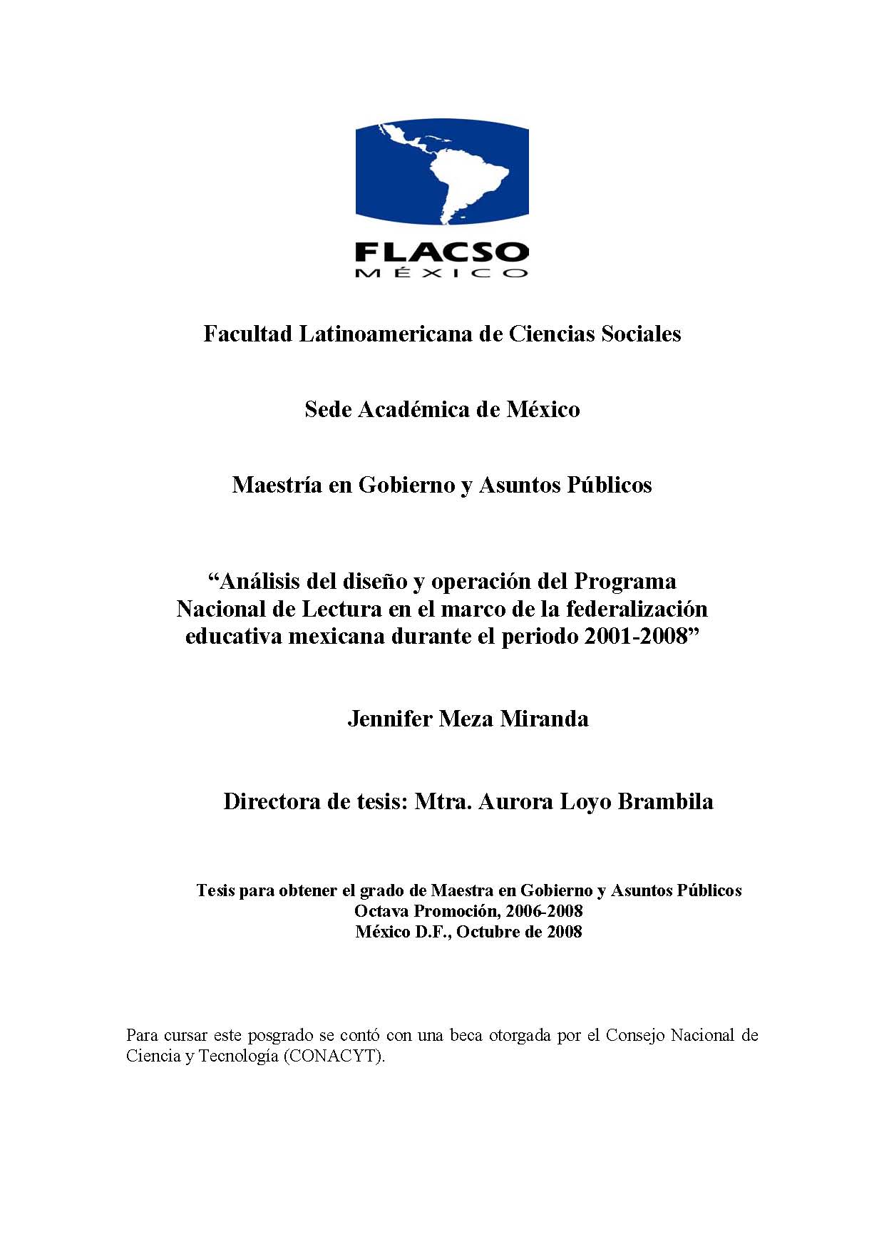 Meza Miranda, Jennifer (2008). Análisis del diseño y operación del Programa Nacional de Lectura en el marco de la federalización educativa mexicana durante el periodo 2001-2008. Maestría en Gobierno y Asuntos Públicos; FLACSO - Sede Académica de México. México. 175 h.