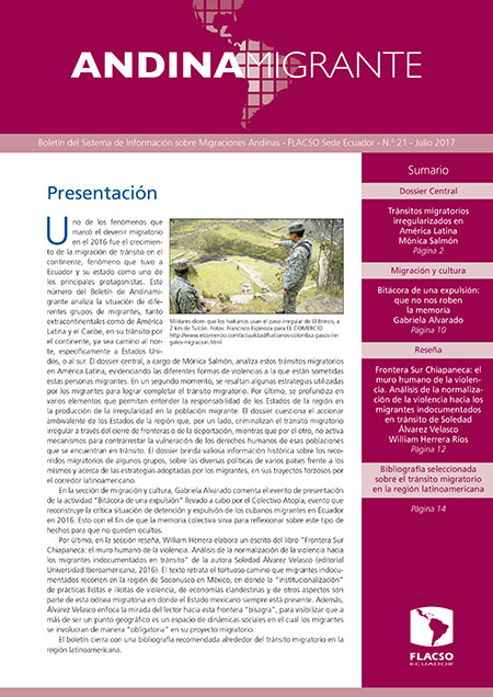 Uno de los fenómenos que marcó el devenir migratorio en el 2016 fue el crecimiento de la migración de tránsito en el continente, fenómeno que tuvo a Ecuador y su estado como uno de los principales protagonistas. Este número del Boletín de Andinamigrante analiza la situación de diferentes grupos de migrantes, tanto extracontinentales como de América Latina y el Caribe, en su tránsito por el continente, ya sea camino al norte, específicamente a Estados Unidos, o al sur.
