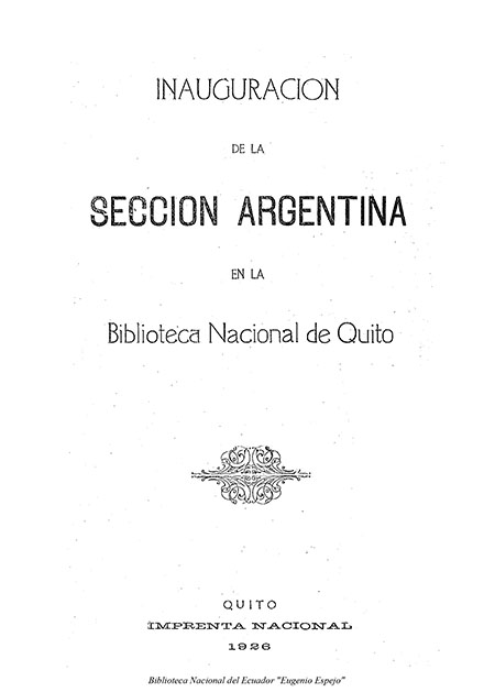 Biblioteca Nacional de Quito. 1926.Inauguración de la sección Argentina en la Biblioteca Nacional de Quito. Quito : Imprenta Nacional.