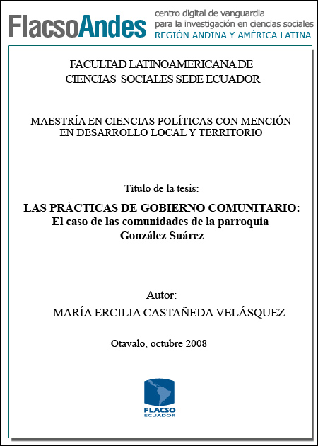 Castañeda Velásquez, María Ercilia (2008). Las prácticas del gobierno comunitario: el caso de las comunidades de la parroquia González Suárez. Maestría en Desarrollo Local y Territorio del Programa Políticas Públicas; FLACSO Sede Ecuador. Quito. 159 p.