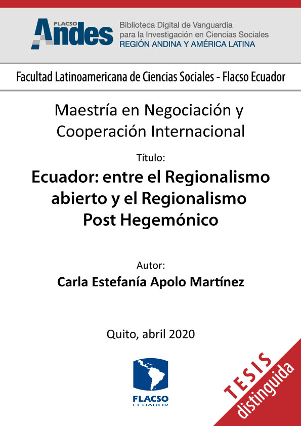 Apolo Martínez, Carla Estefanía. 2020. Ecuador: entre el Regionalismo abierto y el Regionalismo Post Hegemónico. Tesis de maestría, Flacso Ecuador.