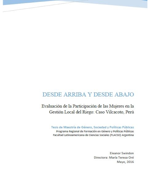 Swindon, Eleanor Mary. 2016. Desde arriba y desde abajo : evaluación de la participación de las mujeres en la gestión local del riego: caso Vilcacoto, Perú. Tesis de Maestría. FLACSO. Sede Académica Argentina, Buenos Aires.