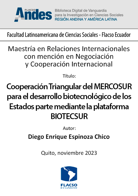 Espinoza Chico, Diego Enrique. 2023. Cooperación Triangular del MERCOSUR para el desarrollo biotecnológico de los Estados parte mediante la plataforma BIOTECSUR. Tesis de maestría, Flacso Ecuador.