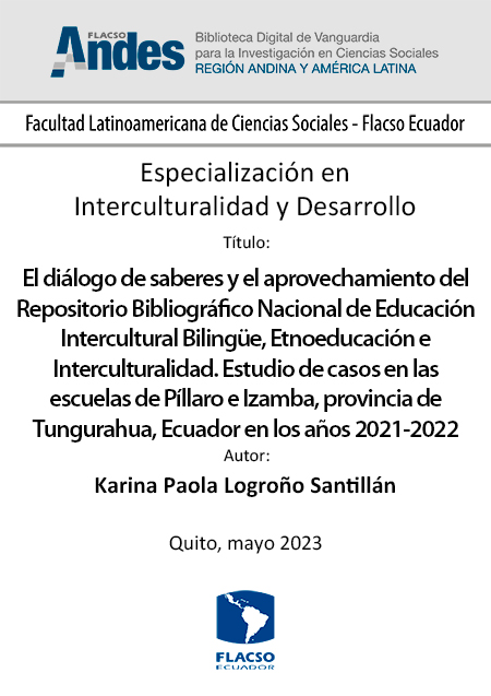 Logroño Santillán, Karina Paola. 2023. El diálogo de saberes y el aprovechamiento del Repositorio Bibliográfico Nacional de Educación Intercultural Bilingüe, Etnoeducación e Interculturalidad. Estudio de casos en las escuelas de Píllaro e Izamba, provincia de Tungurahua, Ecuador en los años 2021-2022. Tesina de especialización, Flacso Ecuador.