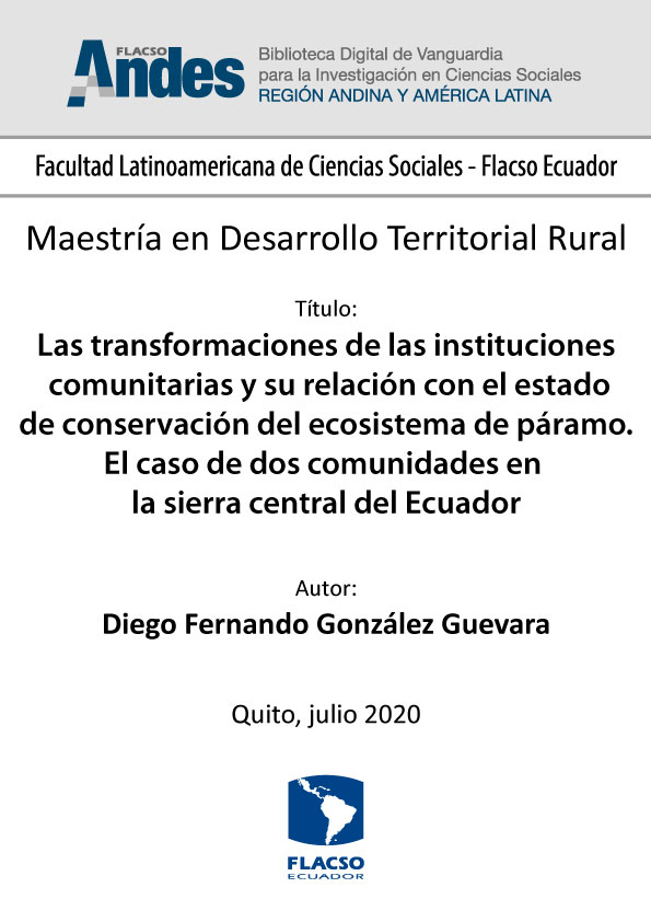 González Guevara, Diego Fernando. 2020. Las transformaciones de las instituciones comunitarias y su relación con el estado de conservación del ecosistema de páramo. El caso de dos comunidades en la sierra central del Ecuador. Tesis de maestría, Flacso Ecuador.