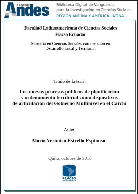 Estrella Espinosa, María Verónica. 2016. Los nuevos procesos públicos de planificación y ordenamiento territorial como dispositivos de articulación del Gobierno Multinivel en el Carchi. Tesis de maestría, Flacso Ecuador.