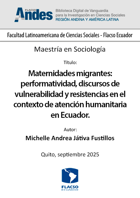 Játiva Fustillos, Michelle Andrea. 2025. Maternidades migrantes: performatividad, discursos de vulnerabilidad y resistencias en el contexto de atención humanitaria en Ecuador. Tesis de maestría, Flacso Ecuador.