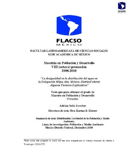 Solís Escobar, Adrián (2010). La desigualdad en la distribución del agua en la delegación Milpa Alta, México, Distrito Federal : algunos factores explicativos. Maestría en Población y Desarrollo; FLACSO México. México. 154 h.
