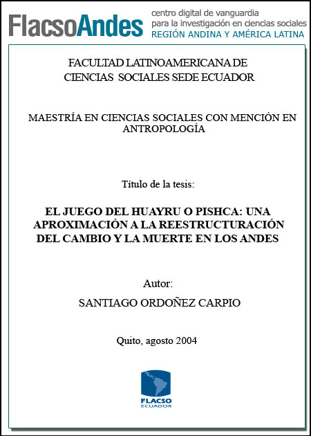 Ordóñez Carpio, Santiago (2004). El juego del huayru o pishca: una aproximación a la reestructuración del cambio y la muerte en los Andes. Maestría en Ciencias Sociales con mención en Antropología e Historia, FLACSO, Sede Ecuador : Colegio Andino. Centro de Estudios Regionales Andinos Bartolomé de las Casas. [s.l.]. 115 p.