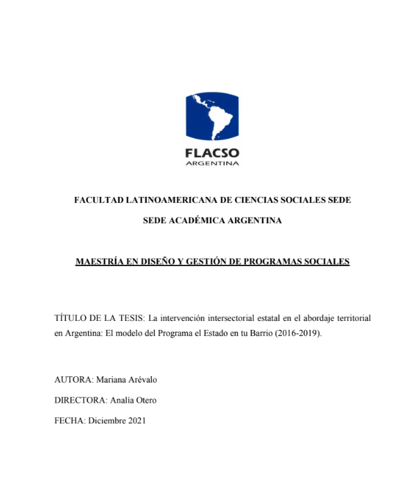 Arévalo, Mariana (2021). La intervención intersectorial estatal en el abordaje territorial en Argentina : el modelo del Programa el Estado en tu Barrio 2016-2019. Tesis de Maestría. FLACSO. Sede Académica Argentina, Buenos Aires.