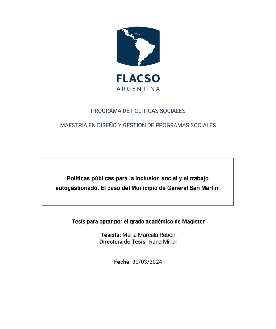 Rebón, María Marcela (2024). Políticas públicas para la inclusión social y el trabajo autogestionado: el caso del Municipio de General San Martín. Tesis de Maestría. FLACSO. Sede Académica Argentina, Buenos Aires.