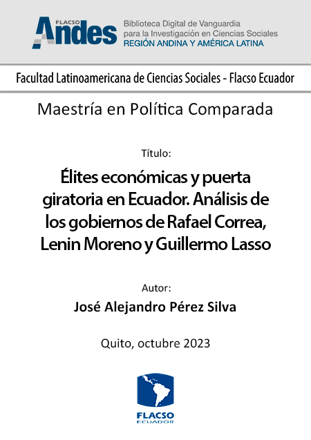 Pérez Silva, José Alejandro. 2023. Élites económicas y puerta giratoria en Ecuador. Análisis de los gobiernos de Rafael Correa, Lenin Moreno y Guillermo Lasso. Tesis de maestría, Flacso Ecuador.