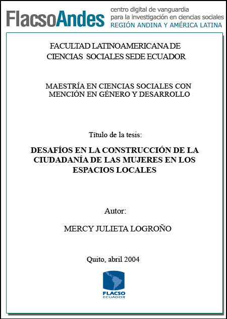 Logroño, Mercy Julieta (2004). Desafíos en la construcción de la ciudadanía de las mujeres en los espacios locales. Maestría en Ciencias Sociales con mención en Género y Desarrollo; FLACSO - Sede Ecuador. Quito. 106 p.