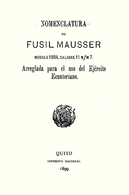 Ejército Ecuatoriano. 1899. Nomenclatura de fusil Mausser modelo 1884, calibre 11M/M7: arreglada para el uso del Ejército Ecuatoriano. Quito, Ecuador : Imprenta Nacional.